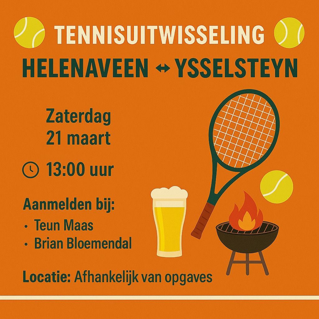 Op Zaterdag 21 Maart vanaf 13:00 uur een gezellige tennisuitwisseling tussen Helenaveen en Ysselsteyn.